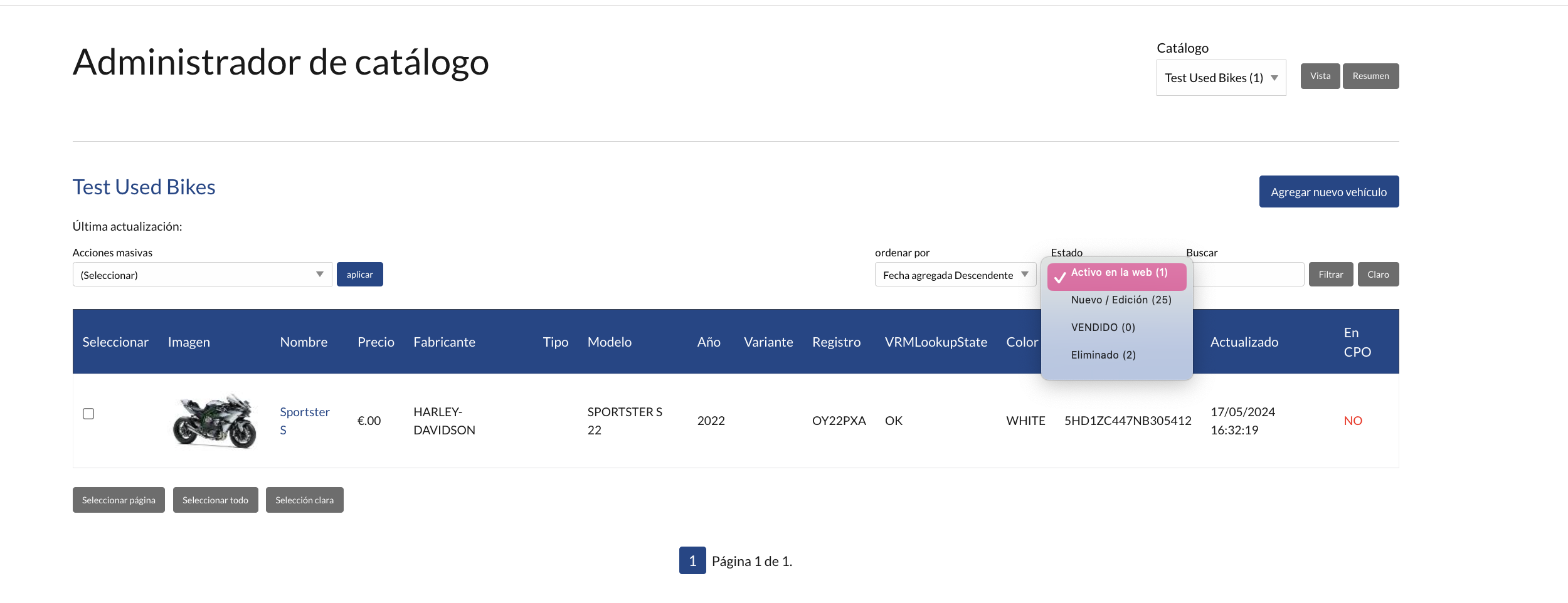 Una vez que una motocicleta se marque como Vendida o Eliminada, dejará de aparecer activa y se eliminará del sitio web.